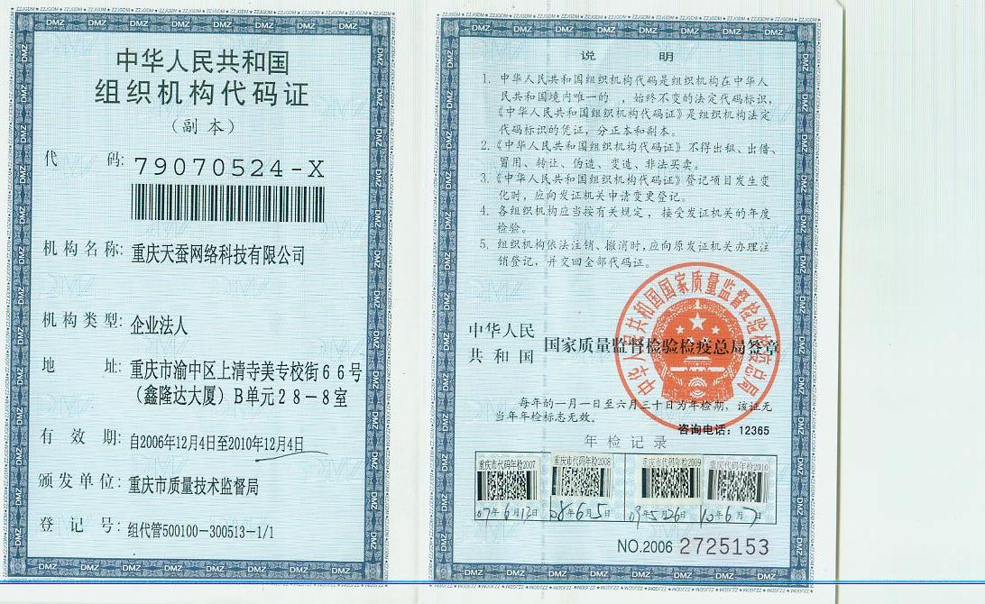 重慶天蠶網(wǎng)絡(luò)科技有限公司 組織機(jī)構(gòu)代碼證                  重慶天蠶網(wǎng)絡(luò)科技有限公司稅務(wù)登記證(地稅)