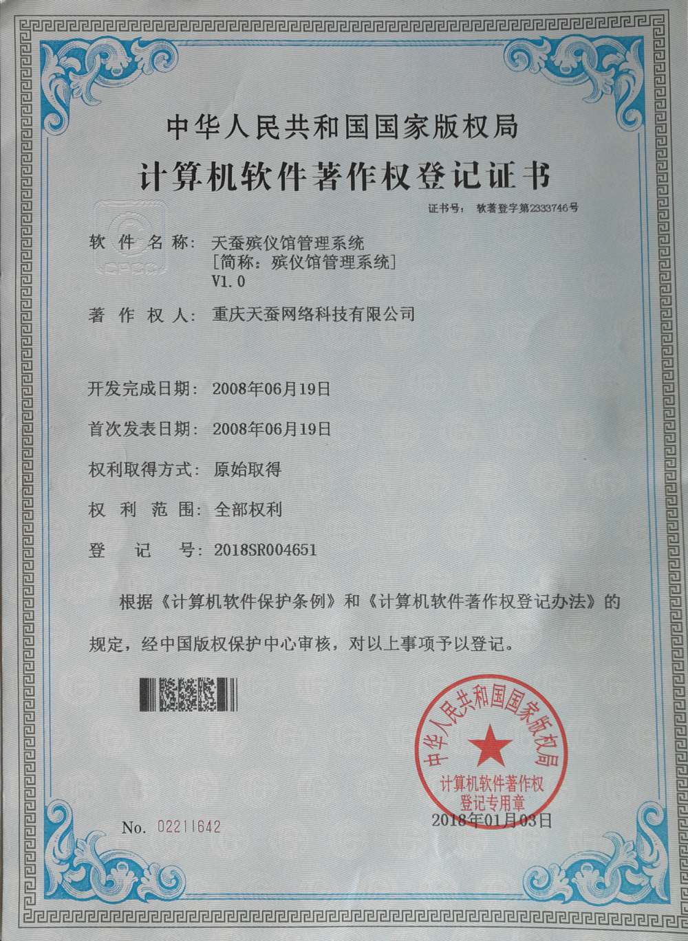 重慶天蠶網(wǎng)絡科技有限公司營業(yè)執(zhí)照 重慶天蠶網(wǎng)絡科技有限公司稅務登記證(國稅) 重慶天蠶網(wǎng)絡科技有限公司 組織機構(gòu)代碼證 華夏餐飲域名證書 陵園辦公自動化系統(tǒng)3.0 著作權(quán)登記證書 重慶天蠶網(wǎng)絡科技有限公司稅務登記證(地稅)